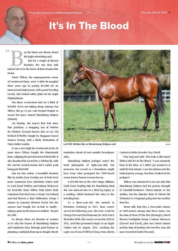 Her three co-investors had set a limit of $20,000. We’re not talking sheep stations, but Tibbey did go 25 per cent beyond budget to secure the mare, named Mandalong Snitjess (Snitzel).